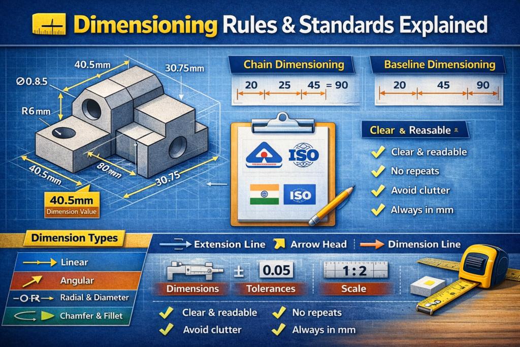 рдЗрдВрдЬреАрдирд┐рдпрд░рд┐рдВрдЧ рдбреНрд░рд╛рдЗрдВрдЧ рдореЗрдВ рдбрд╛рдЗрдореЗрдВрд╢рди (Dimension) рд╡рд╣ рдЬрд╛рдирдХрд╛рд░реА рд╣реЛрддреА рд╣реИ, рдЬреЛ рдХрд┐рд╕реА рднреА рдкрд╛рд░реНрдЯ рдХреЗ рдЖрдХрд╛рд░, рдорд╛рдк рдФрд░ рд╕реНрдерд┐рддрд┐ рдХреЛ рд╕реНрдкрд╖реНрдЯ рд░реВрдк рд╕реЗ рдмрддрд╛рддреА рд╣реИред