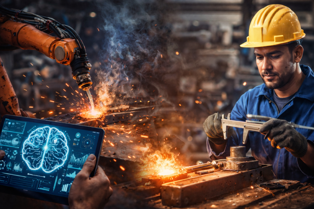 उदाहरण के लिए, welding में AI robot arc चला सकता है, लेकिन electrode selection, joint condition, material quality और site situation को समझने के लिए skilled welder की जरूरत रहती है। अगर welding में defect आ जाए, तो AI उसे identify कर सकता है, लेकिन cause को समझकर process सुधारना आज भी इंसान का काम है।